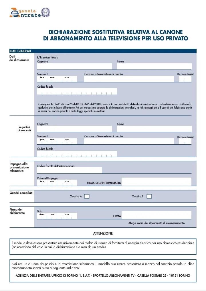 AGENZIA DELLE ENTRATE – UFFICIO TORINO 1 S.A.T. – SPORTELLO ABBONAMENTI TV – 10121 – TORINO