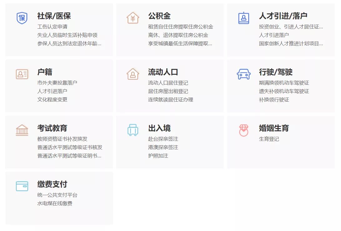 浙江省的“浙里办”、广东省的“粤省事”、安徽省的“皖事通”、福建省的“闽政通”、陕西省的“秦务员”、上海市的“随申办”、湖南省的“新湘事成”、河南省的“豫事办”、北京市的“北京通”、江苏省的“苏政通”、黑龙江省的“全省事”、江西省的“赣服通”、重庆市的“渝快办”、四川省的“天府通办”、云南“办事通”、河北省的“冀时办”、辽宁省的“辽事通”、湖北省的“鄂汇办”、甘肃省的“陇政通”……