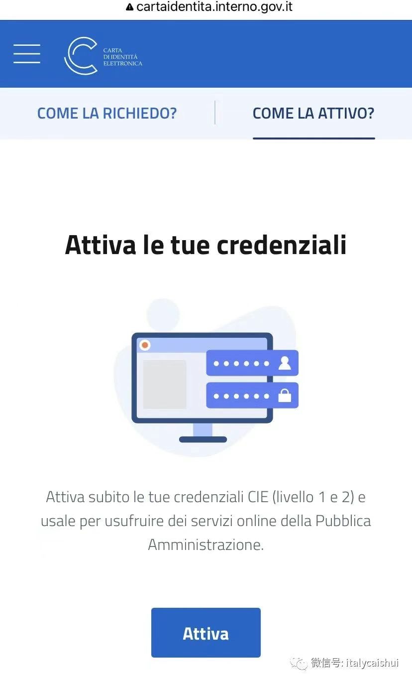 激活CIE在线登录功能。进入网站cartaidentita.interno.gov.it,选择 Attiva le tue credenziali,选择attivazione alternativa,输入税号,身份证序列号(il numero di serie della carta),位于卡片的右上角。然后设置就成功了。