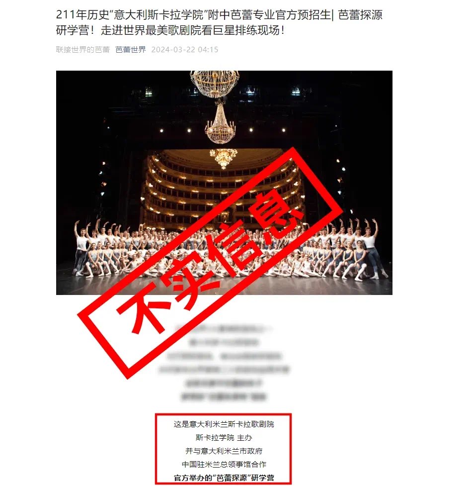 近日,我馆注意到网络账号“芭蕾世界”在微信公众号、搜狐网平台发布题为“211年历史‘意大利斯卡拉学院’附中芭蕾专业官方预招生| 芭蕾探源研学营!走进世界最美歌剧院看巨星排练现场!”的研学营招生广告,声称该研学营由“意大利米兰斯卡拉歌剧院、斯卡拉学院主办,并与意大利米兰市政府、中国驻米兰总领事馆合作”。