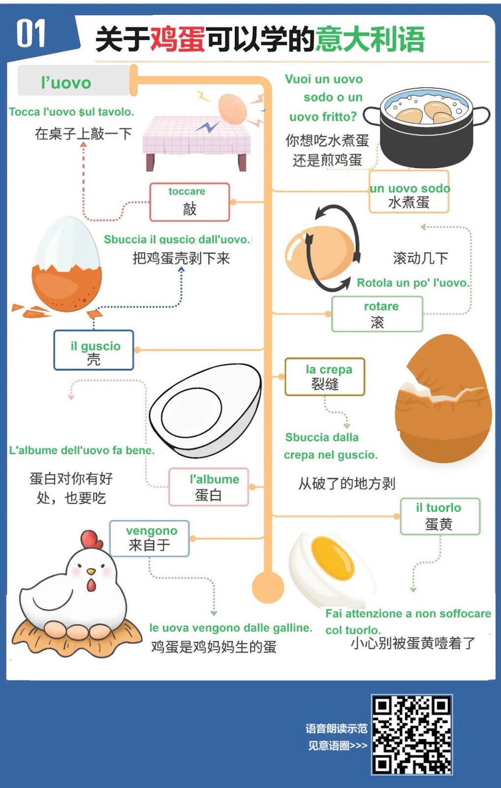 【今日打卡】 l'uovo:蛋Tocca l'uovo sul tavolo.:在桌子上碰一下蛋。toccare:碰Sbuccia il guscio dall'uovo.:剥蛋壳。il guscio:蛋壳l'albume:蛋白L'albume dell'uovo fa bene.:蛋白有益。le uova vengono dalle galline.:鸡蛋来自鸡。Vuoi un uovo sodo o un uovo fritto?:你想要煮鸡蛋还是煎鸡蛋?Uovo sodo.:煮鸡蛋。rotare:滚动Rotola un po' l'uovo.:把鸡蛋滚一下。Sbuccia dalla crepa nel guscio.:从蛋壳上的裂缝处剥开。il tuorlo:蛋黄Fai attenzione a non soffocare col tuorlo.:小心别噎着蛋黄。