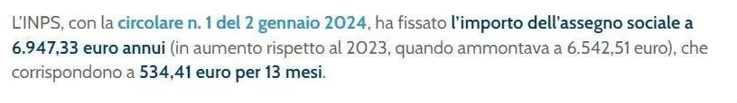 根据各大意媒消息,INPS根据 la circolare n. 1 del 2 gennaio 2024法令将社会津贴金额限定为了6947.33欧元,按照13个月的算法,每月为534.41欧元。(原文如下)