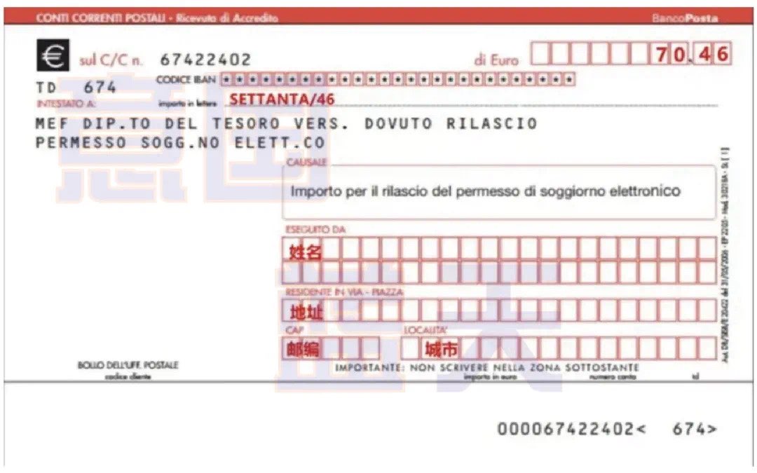 除了在邮局拿居留信封以外,为了买新一年的保险,还需要自己在邮局里拿到空白的邮局账单(Bollettino Postale)。如图所示:
