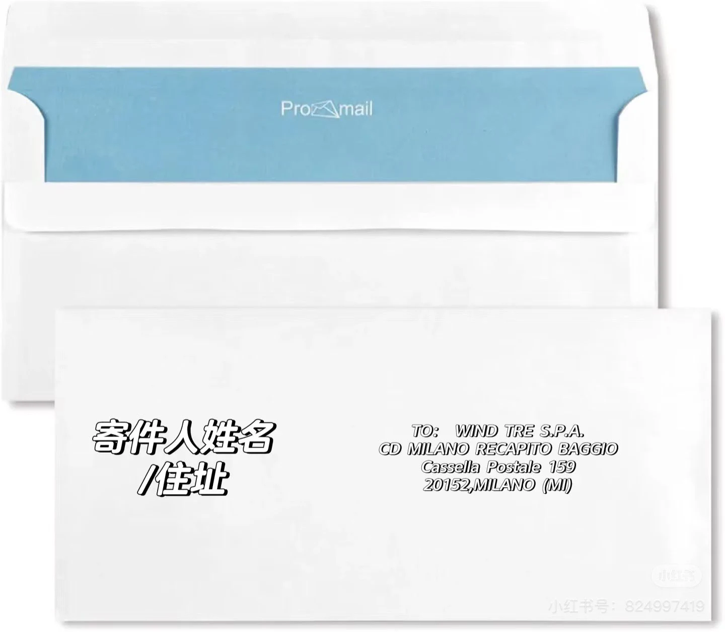 [红色心形R]步骤二: 去Tabacchi, 买一个信封✉️( busta della lettera), 0.30欧左右,在信封正面左侧写上自己的姓名和住址,右侧写收信地点(如图3)