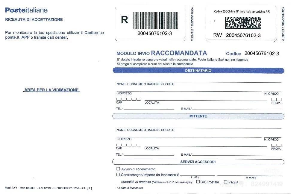 填完表格需要自己去邮局寄挂号信lettera raccomandata