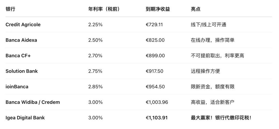 ✅ 别忘记税率是26%:意大利存款利息要缴税,别光看“年化收益”。