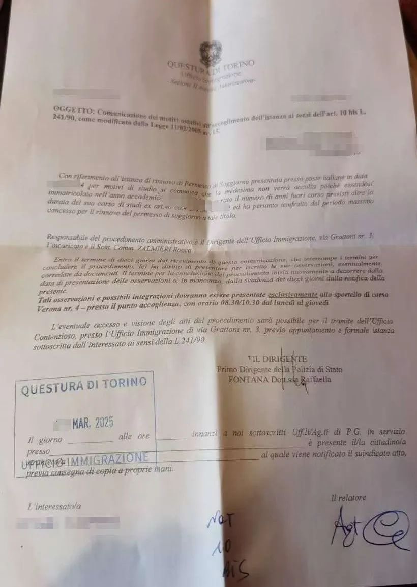 意大利官方称之为 Comunicazione dei motivi ostativi all’accoglimento dell’istanza,简称“居留办理受阻通知”。信中通常会指出一项或多项被认定为问题的理由,并明确指出你可以提交 controdeduzioni(回应说明),为自己的申请辩护。