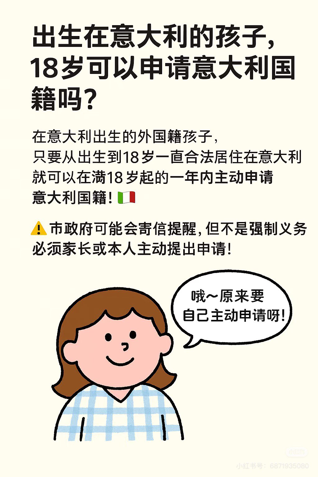 虽然很多Comune会在孩子满18岁前寄出一封提醒信(suggerimento o invito),告诉你可以申请国籍,但没有寄出不等于你不能申请,所以不要等信件,建议家长提前准备、主动申请。