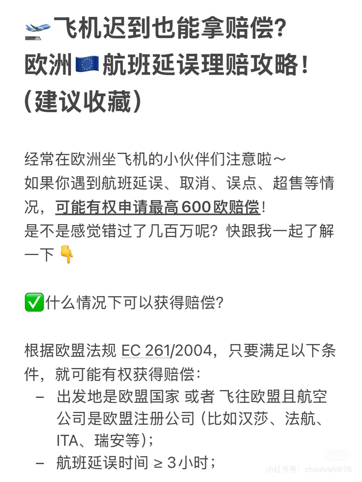 📌 欧盟航班延误3小时以上 = 有机会拿€250–600赔偿!